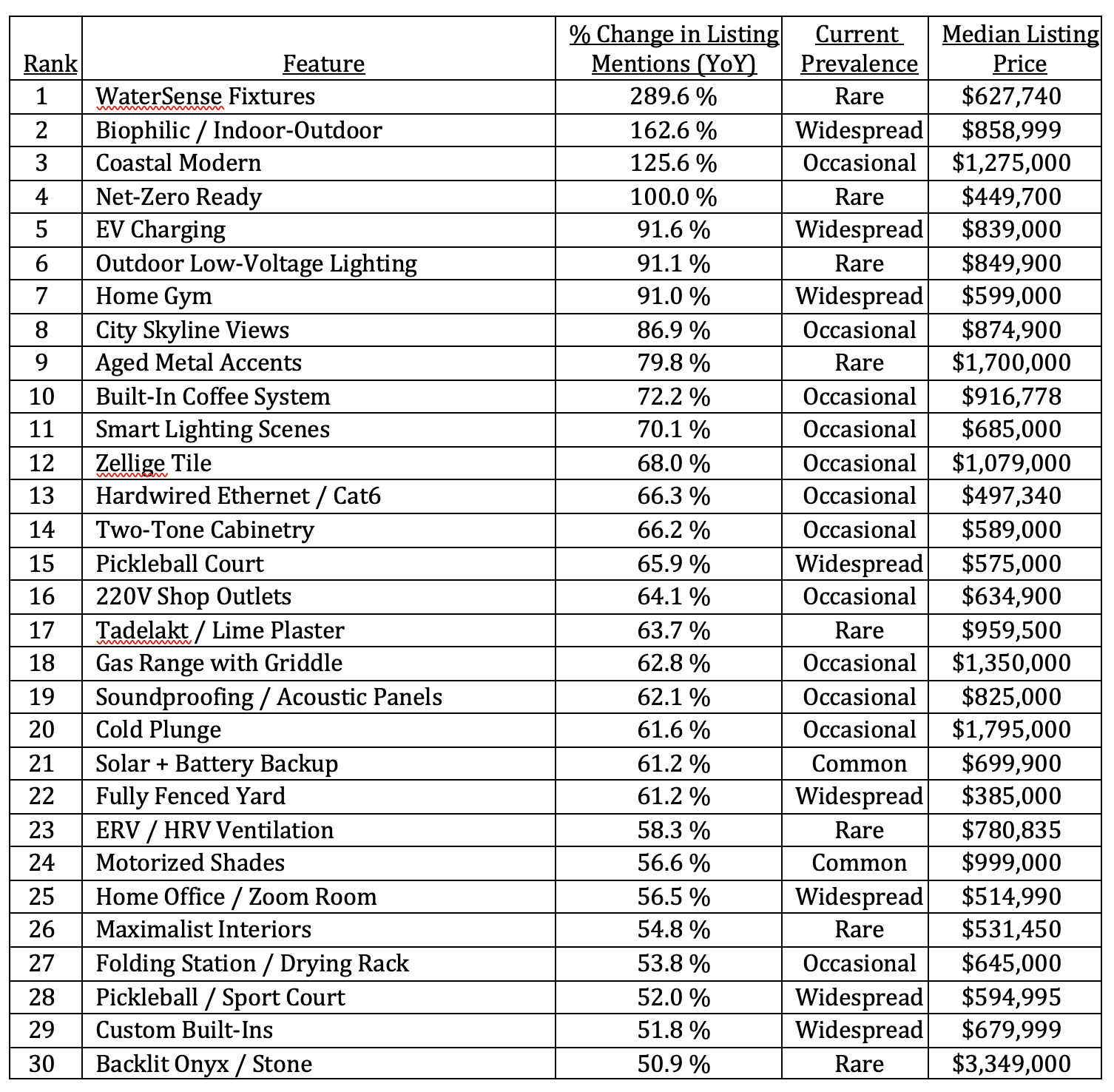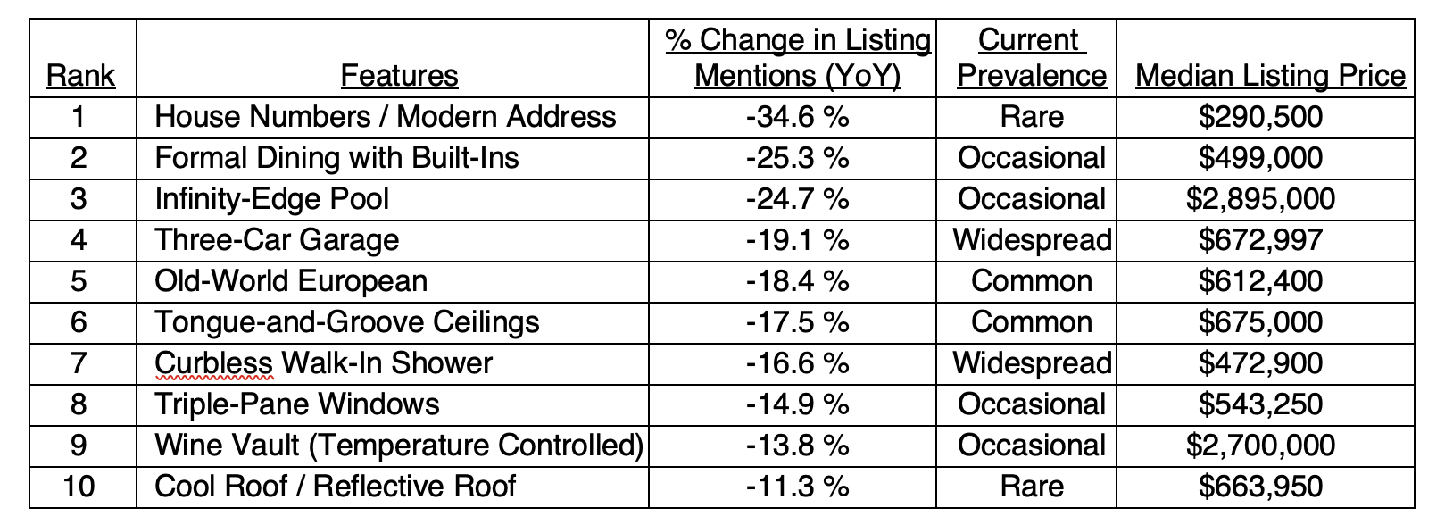 (The table below highlights the 10 most common home features of the past year, ranked by current prevalence in listing mentions.)